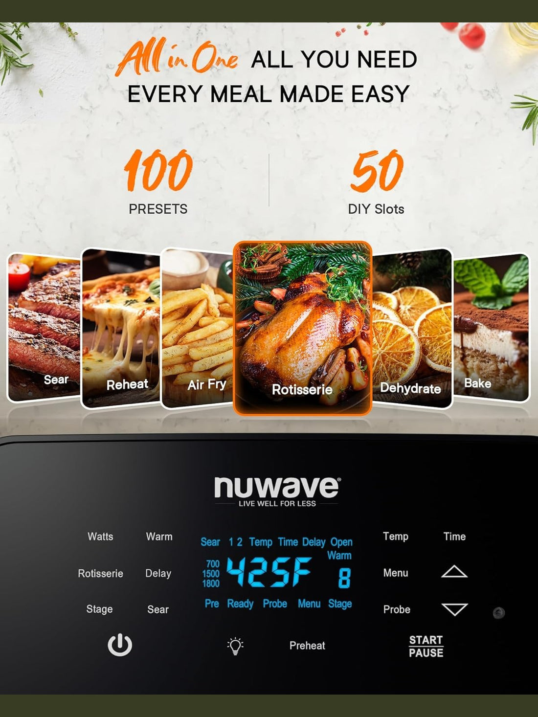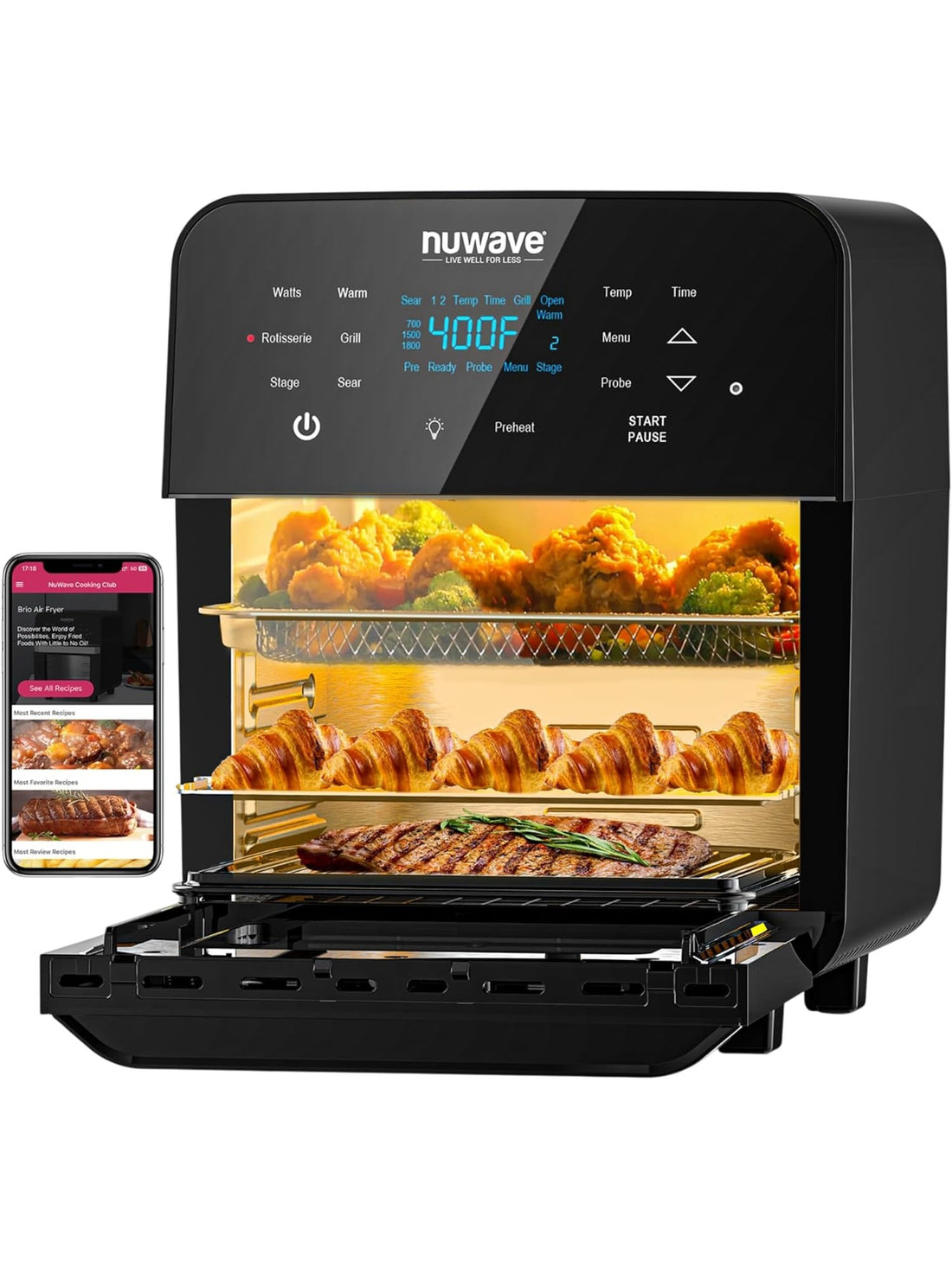 Nuwave Brio 15.5Qt Air Fryer Rotisserie Oven, X-Large Family Size, Powerful 1800W, 4 Rack Positions, 50°-425°F Temp Controls, 100 Presets & 50 Memory, Integrated Smart Thermometer, Linear T Technology
