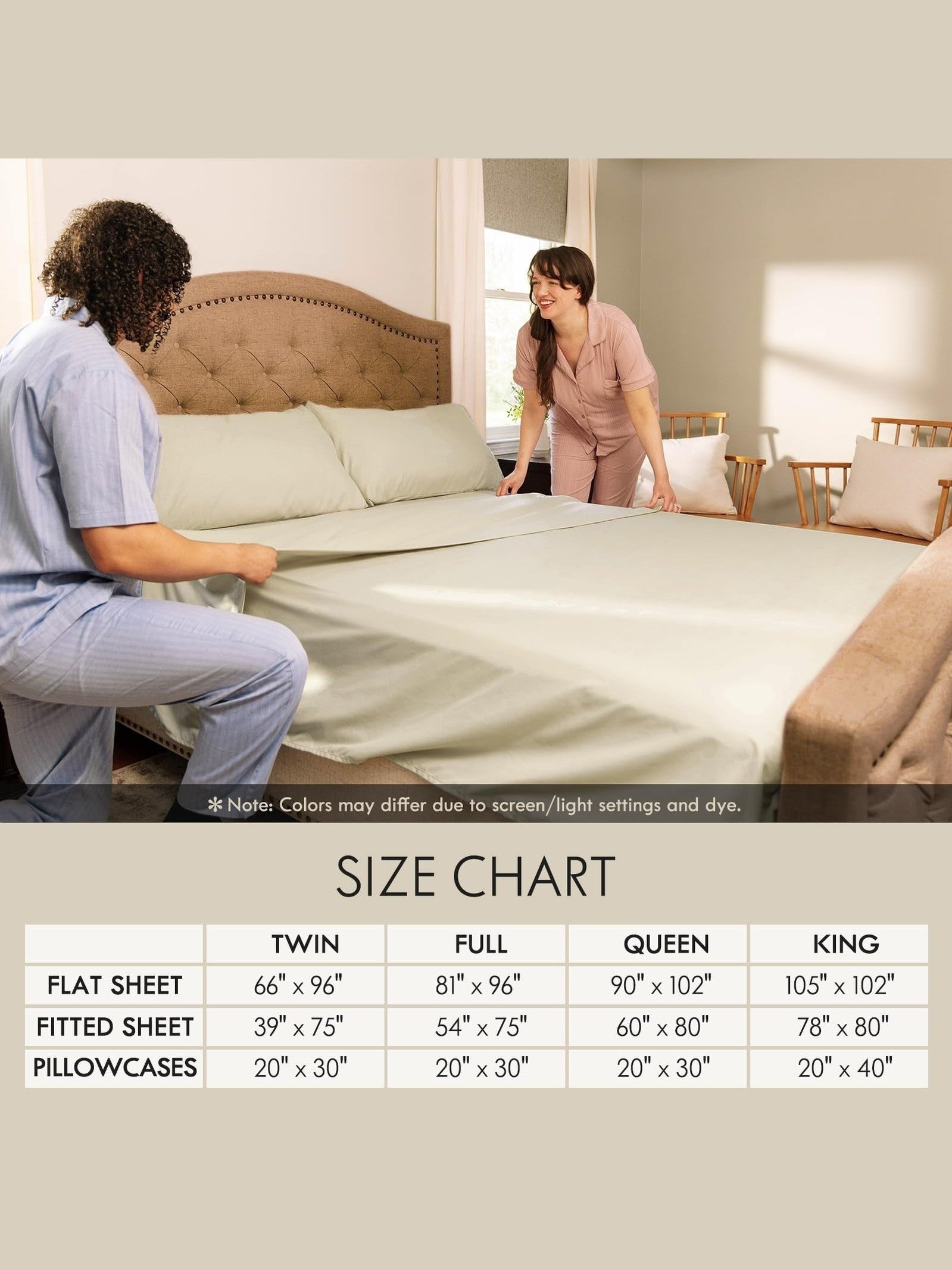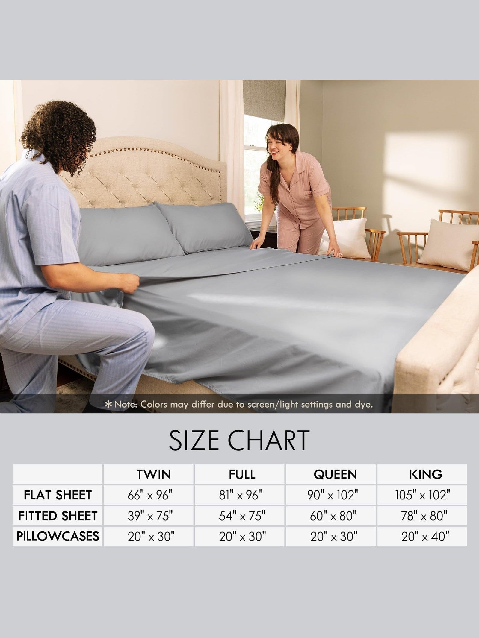 | Twin | 4-Piece | 1 Flat Sheet, 1 Fitted Sheet, 2 Pillowcases |