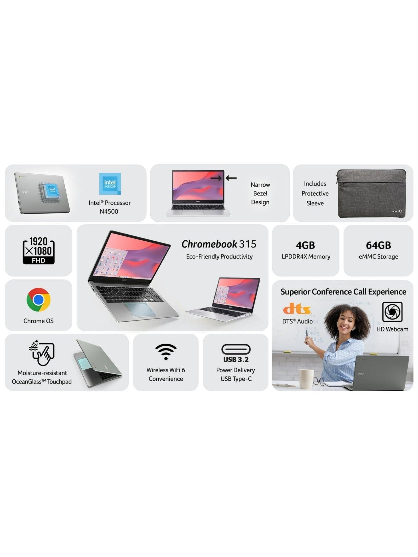 Acer Chromebook 315 15.6" FHD Intel Celeron N4500 4GB RAM 64GB Refurbished
