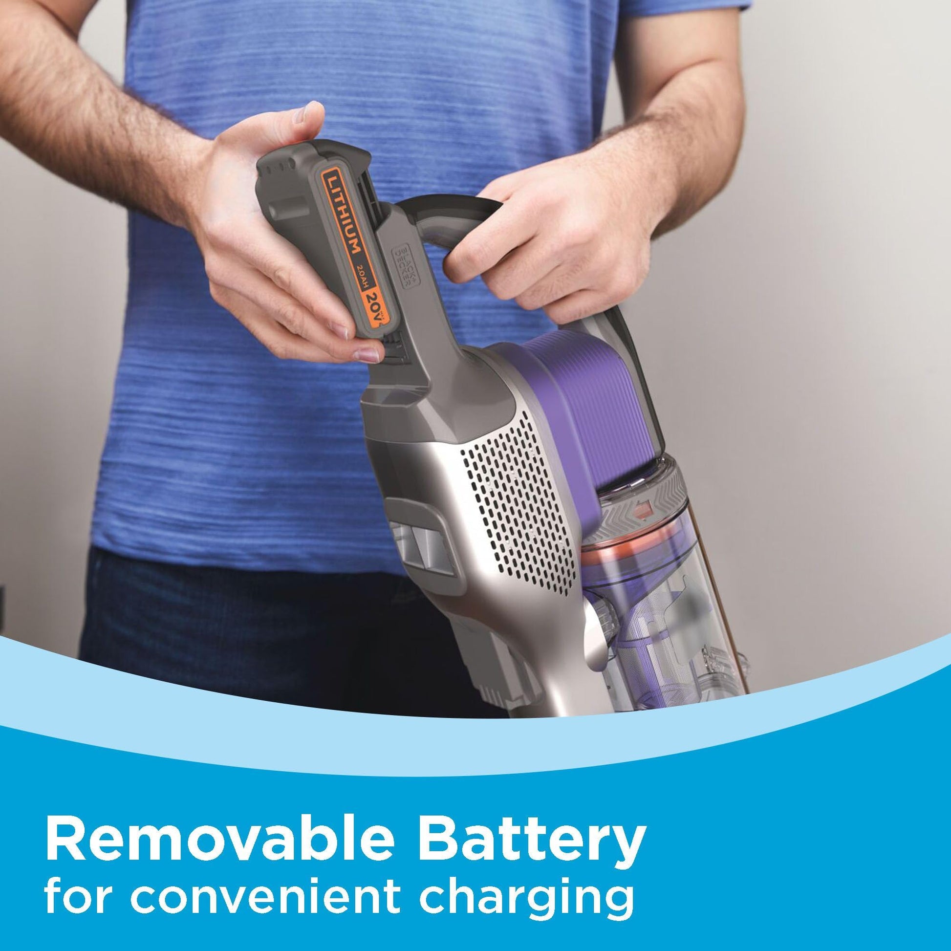 The POWERSERIES Extreme Pet 20V MAX Cordless Stick Vacuum features the 3X Cleaning System: 1) Floorhead angle is designed to clean up multiple surfaces, from hard floors, to area rugs, and carpets; 2) The V-shaped bristle pattern is designed to pick up messes of various sizes, including pet hair, dust, and crumbs 3) The patented anti-tangle brush bar is designed to minimize hair wrap and maximize suction power. This pet hair vacuum cordless is engineered for homes with pets, making cleanup easier and more efficient.The front-facing dustbin gives quick access when emptying, and allows the cordless pet vacuum cleaner to lay flat for hard-to-reach areas. The built-in twist to clean filter provides up to twice the suction power. 3-speed control lets you select the right power for clean up on hard surfaces, area rugs, or powerful pick up on carpet. Enjoy the convenience of a portable vacuum cordless design, perfect for maneuvering throughout your home.The POWERSERIES Extreme stick vacuum cordless rechargeable delivers up to 55 minutes of run time. Detach the removable 20V MAX battery to charge separately from the vacuum, or leave in your vacuum to charge while itself stands or when placed on its wall mount. As a stair vacuum for carpet, it’s ideal for daily use and tackling stubborn pet messes. If you’re searching for a couch vacuum pet hair, this model offers the reliability and power needed to keep your home clean and comfortable. *Compared to BLACK+DECKER HCUA525JP