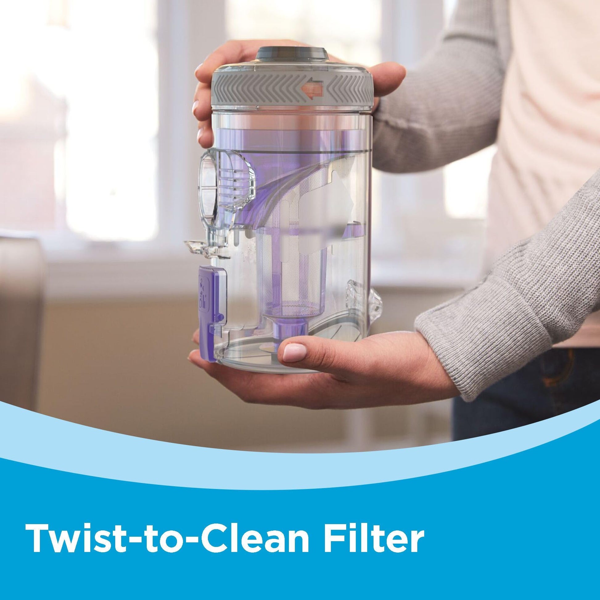 • Vacuum cleaners for home pet hair: Patented brush bar with rubber bristles engineered to remove pet hair and stubborn dirt. Front-facing dustbin gives quick access when emptying, and allows vacuum to lay flat for hard-to-reach areas. Twist to clean: built-in filter cleaner provides up to twice suction. Easily empty dustbin with one touch