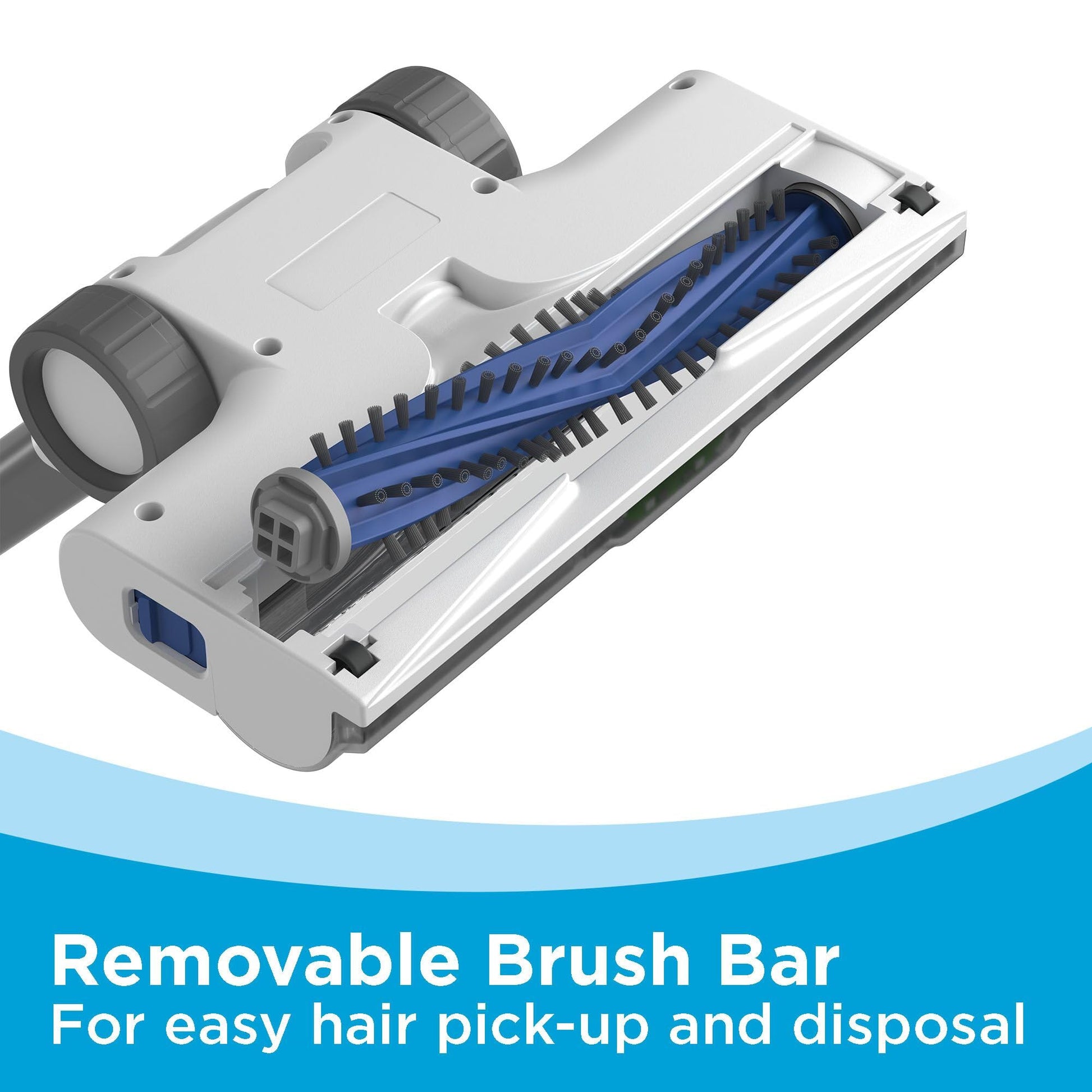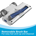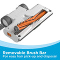 • Anti-tangle brush bar for easy hair pick-up + removal