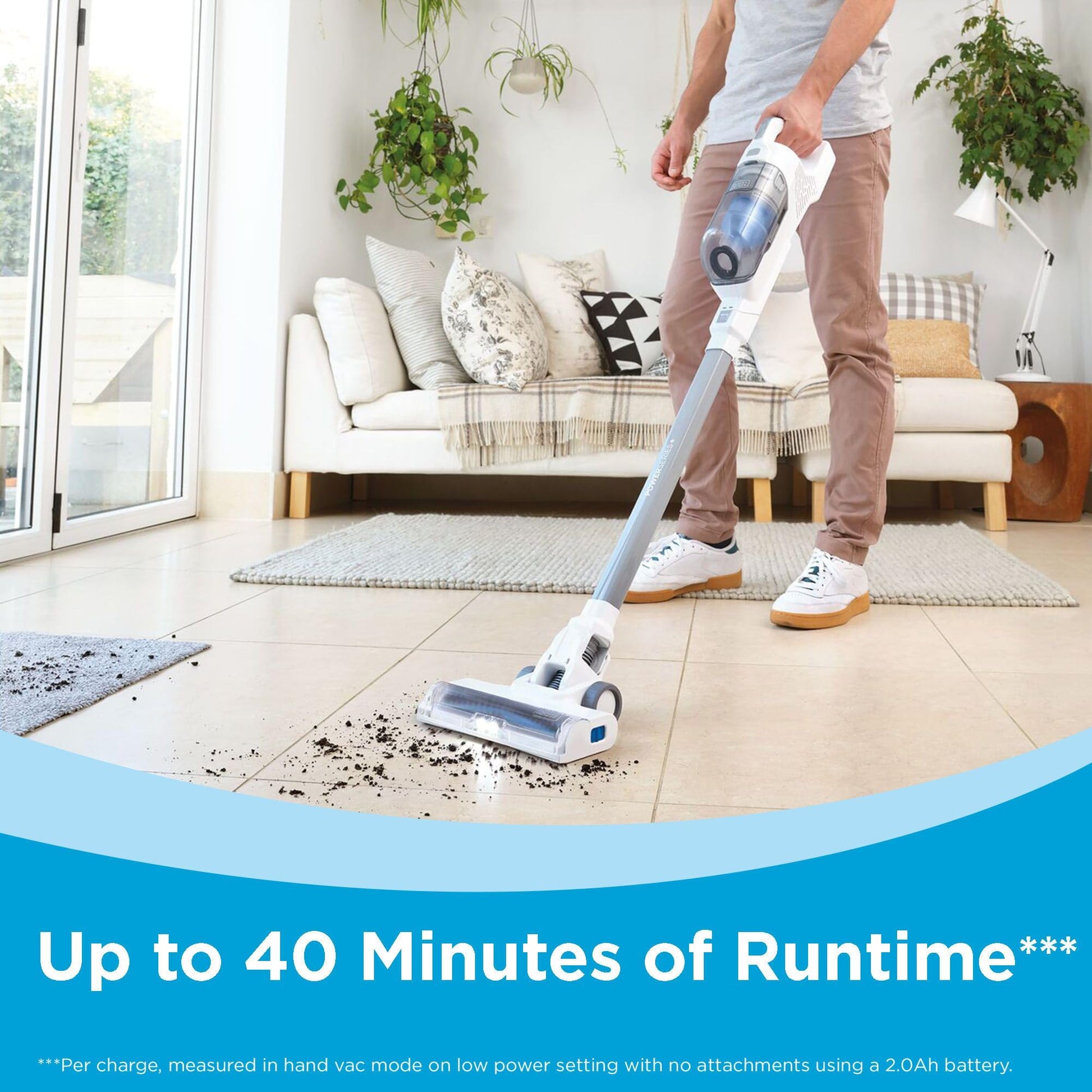 Tackle big messes and tidy your home with the POWERSERIES+ 20V MAX Stick Cordless Vacuum Cleaner. Designed for large spills, this bagless stick vacuum offers up to 25% more pickup on carpets and up to 44 minutes of runtime. Small vacuum cleaner cordless advanced AUTOSENSE technology automatically adjusts suction power based on the floor type, while the cyclonic filtration system maintains a clean filter for optimal performance. The anti-tangle brush bar and integrated LED floorhead lights make picking up pet hair, fur, and debris easy which makes an ideal vacuum for carpet and vacuum for dorm. Easily convert it into a cordless handheld vacuum with the crevice tool to clean stairs and furniture or lay it flat to reach under beds and couches. Upright vacuum cleaners for home: when you're finished, the vacuum's convenient self-standing capability makes storage simple. * Using a 2.0Ah battery vs. BLACK+DECKER HSVB420J **Per charge, measured in hand vac mode on low power setting with no attachments using a 2.0Ah battery