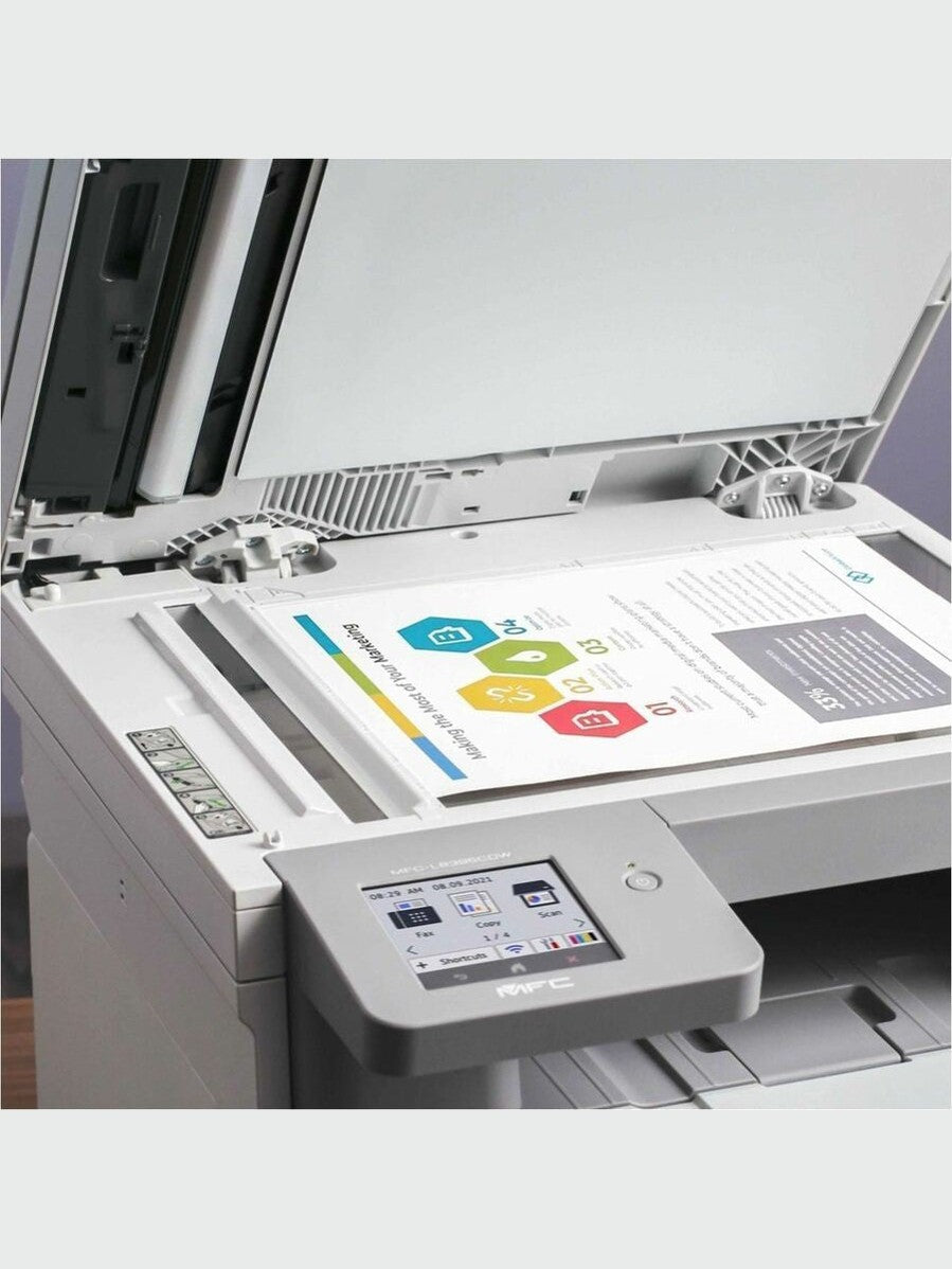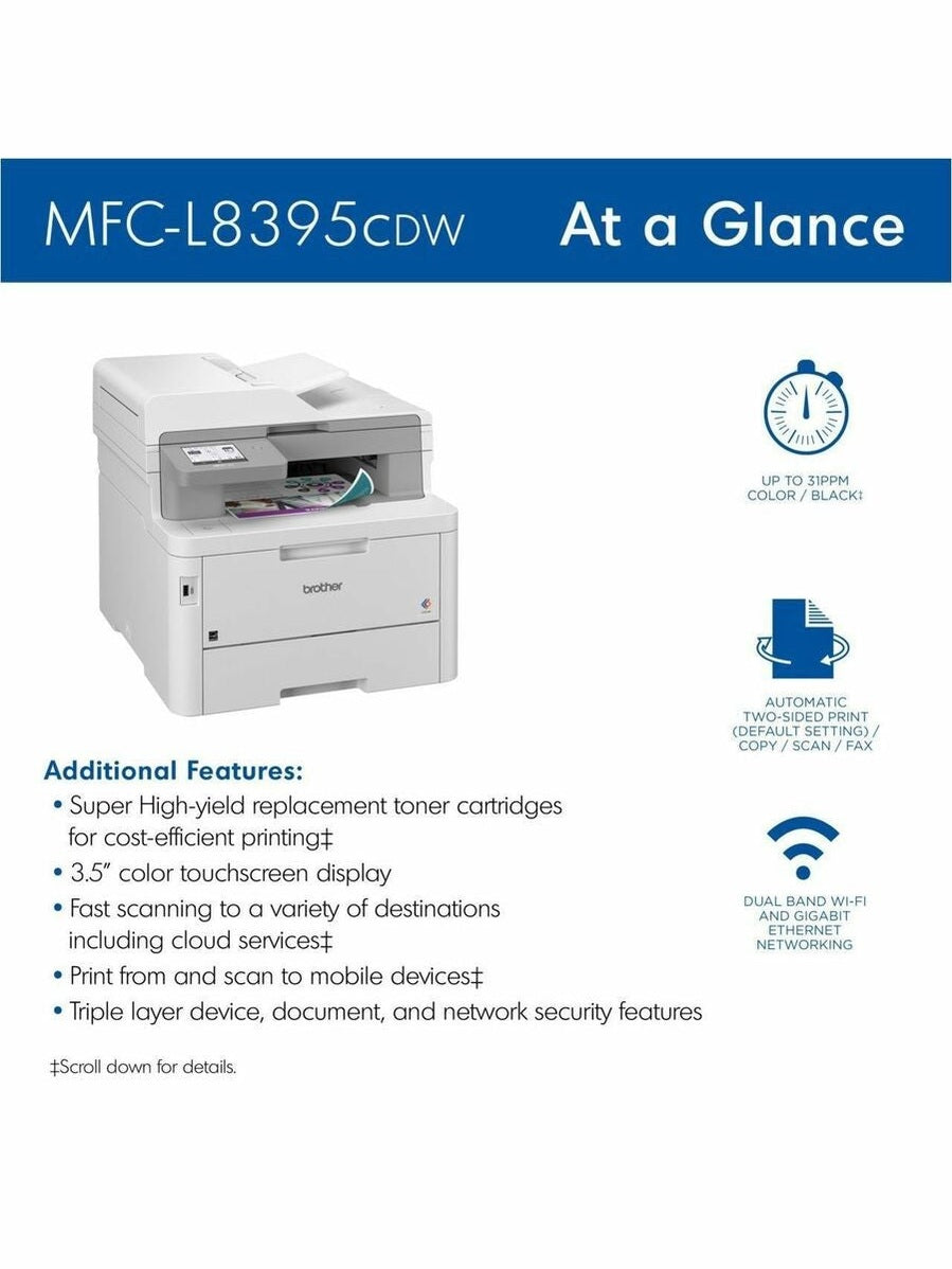 250-sheet input tray is expandable with an optional tray (not included) for versatile paper handling. 3.5" touch screen lets you create customized shortcuts. Brother Workhorse MFC-L8395CDW Digital Color All-in-One Printer with Wireless Networking and Duplex Print, Scan, and Copy - Copier/Fax/Printer/Scanner - 31 ppm Mono/31 ppm Color Print - 2400 x 600 dpi class - 3.5" LCD Touchscreen - Gigabit Ethernet - Hi-Speed USB 2.0.