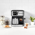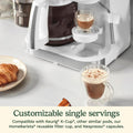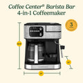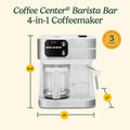 Bring the café home with the Cuisinart® Coffee Center® Barista Bar 4-in-1 Coffee Maker and experience four brew options with compact convenience. Serve friends and family with 12 cups* of fresh coffee brewed to perfection with programmable time and strength settings. (*cup equals approx. 5 oz. (varies by brewing technique) and single-serve cappuccinos, lattes, and espresso.). Or go solo with single-serve cups, in 6-, 8-, and 10 oz. sizes, made in minutes and compatible with most single-serve pods. The coffee machine lets you add variety to drinks with the steam wand that makes frothed and steamed milk for cappuccinos, lattes, or the specialty drink of your choice. The wand is also perfect for pouring hot water for tea, matcha, hot cereals, and soups. With sleek modern styling and total versatility, this space-saving all-in-one Cuisinart® Coffee Center® Barista Bar 4-in-1 Coffee Maker is sure to be the favorite spot in any kitchen.