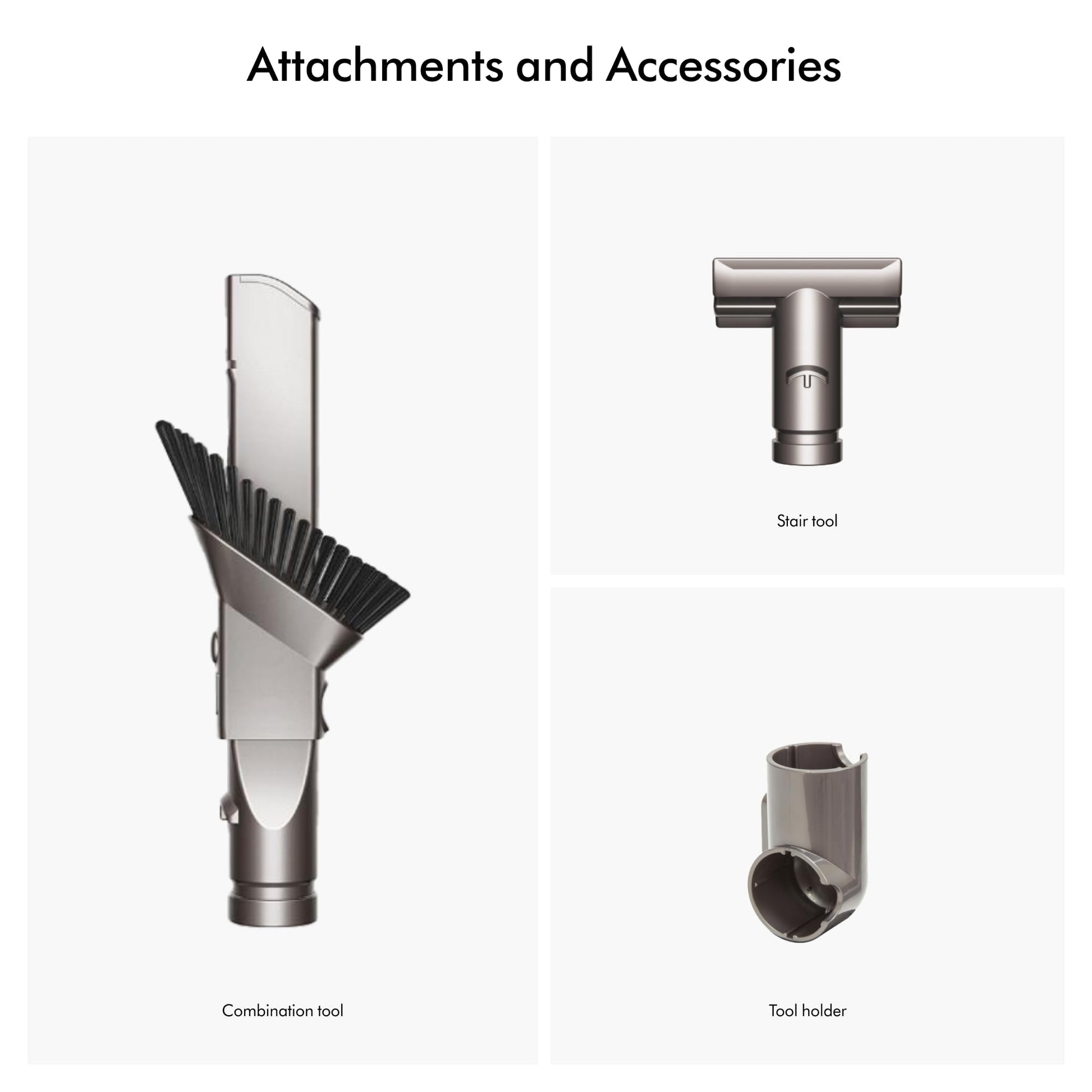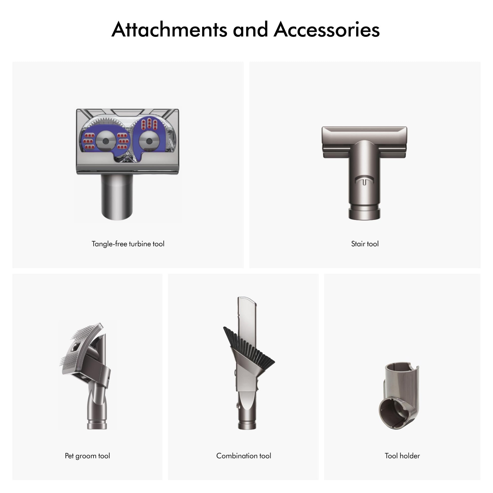 • 5 Dyson-Engineered accessories. Tangle-free turbine tool, groom tool, tool holder, stair tool, combination tool.