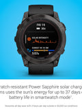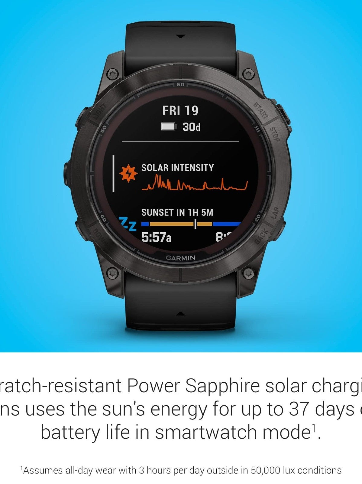 Model Garmin fēnix 7X Pro Sapphire Solar. (1) Garmin fēnix 7X Pro Sapphire Solar Watch. •Solar charging to extend battery life during outdoor activities. •Sapphire crystal lens — highly scratch resistant.