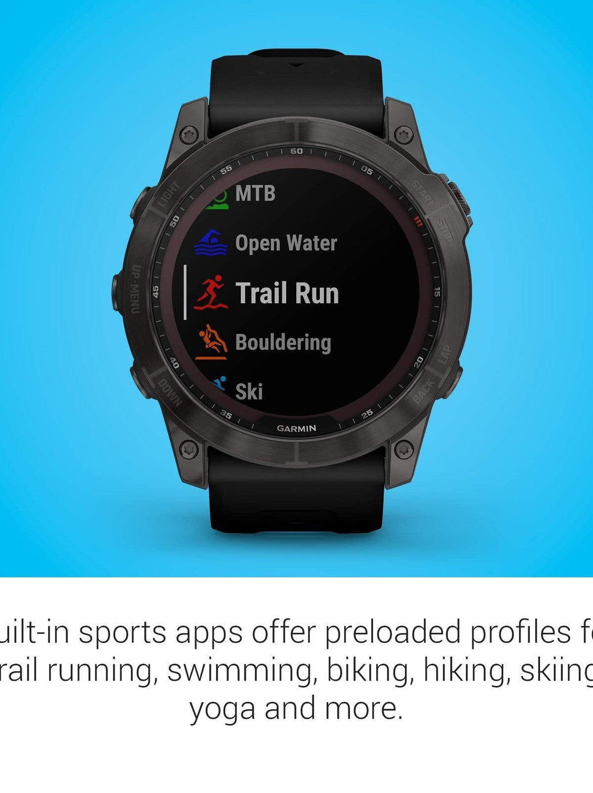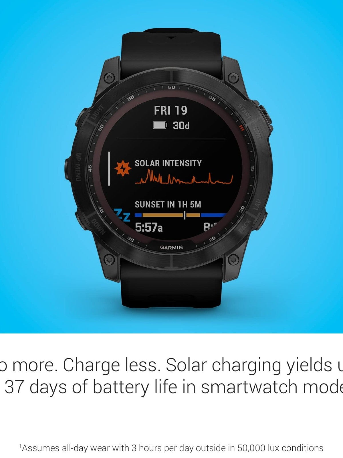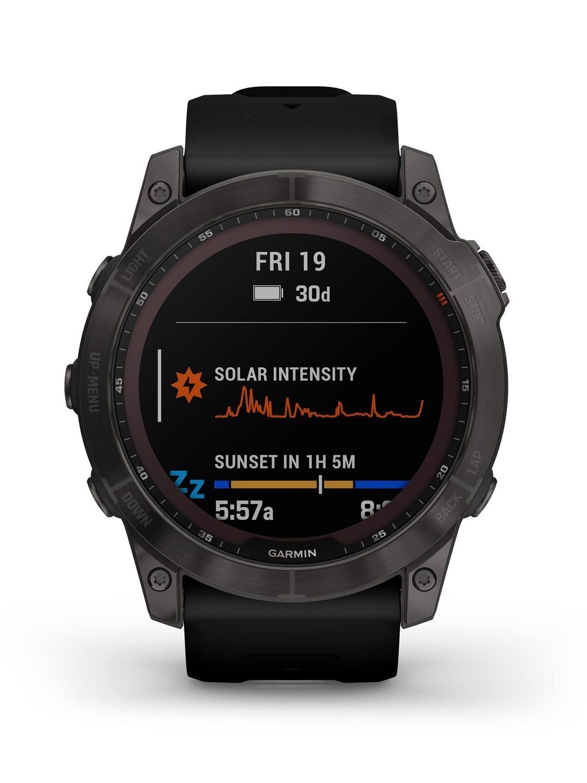 Bezel Material: Carbon Gray DLC Titanium. Solar Charging : Extends battery life with Power Sapphire solar glass. Battery Life PacePro and ClimbPro Features. Daily Suggested Workouts. Ambient Light Sensor.