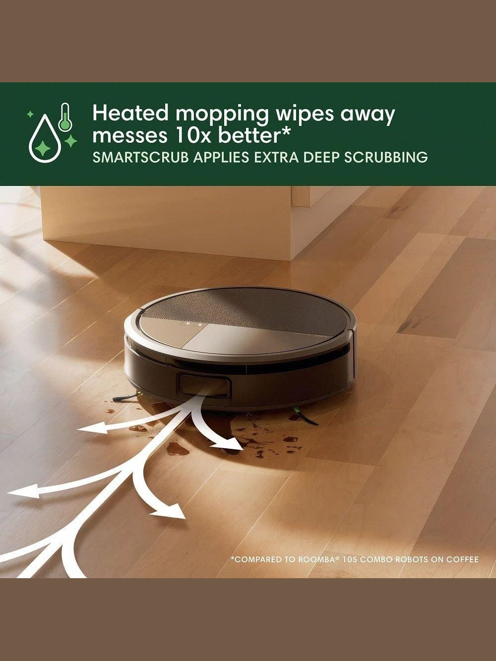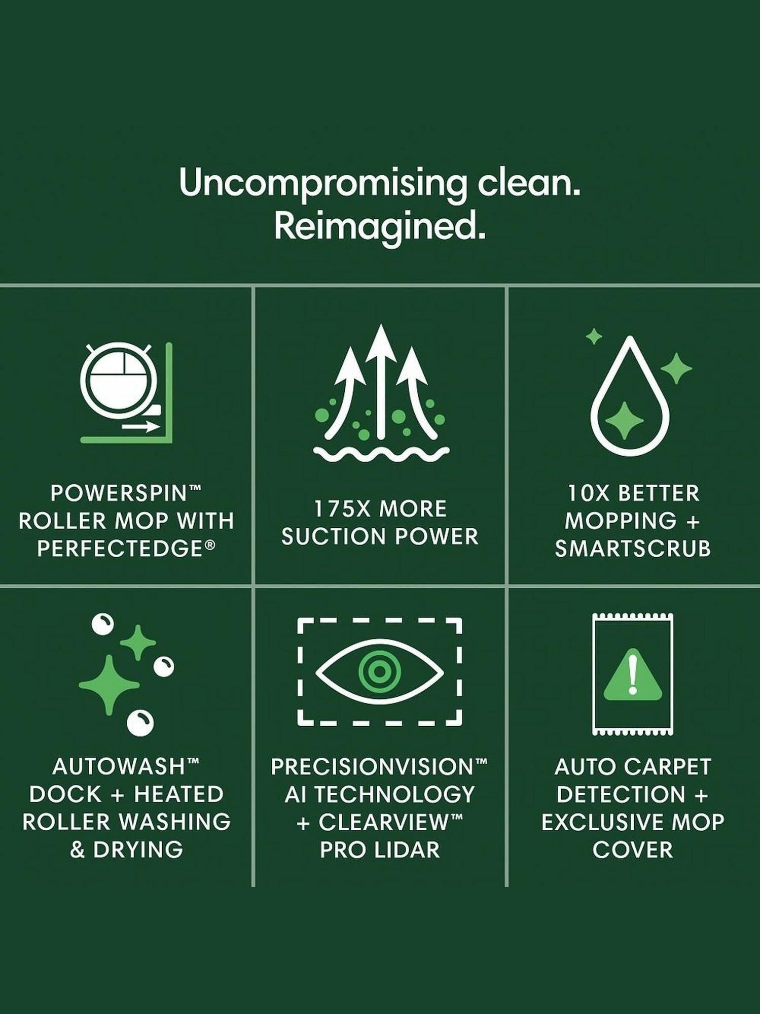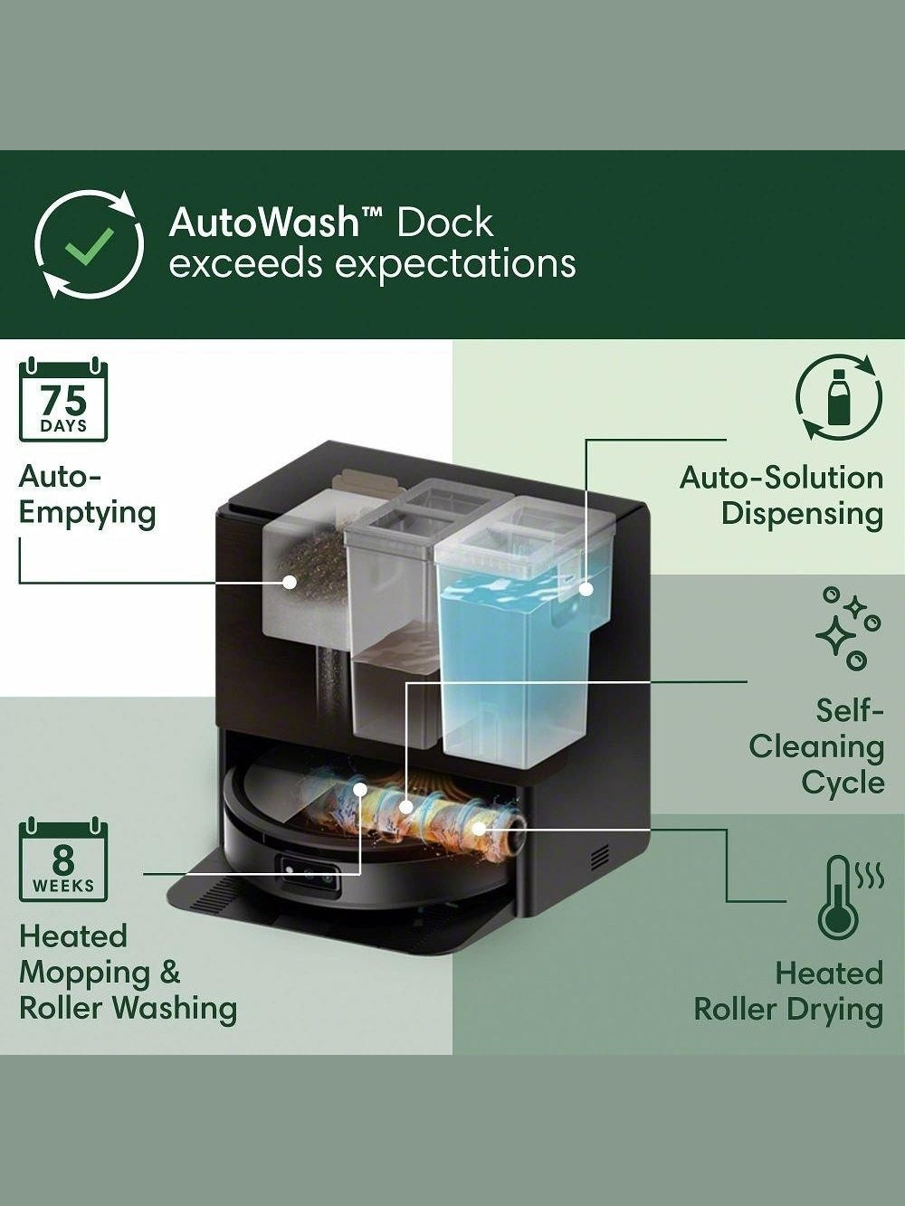 AutoWash Dock powers a pristine clean. Eliminates stubborn stains with heated mopping and the PowerSpin Roller Mop, spinning at 200 RPMs and applying consistent pressure for spotless, streak-free mopping.