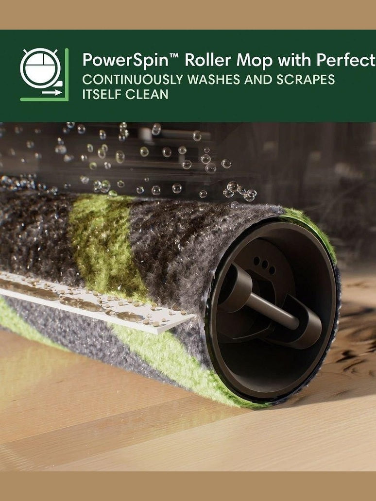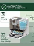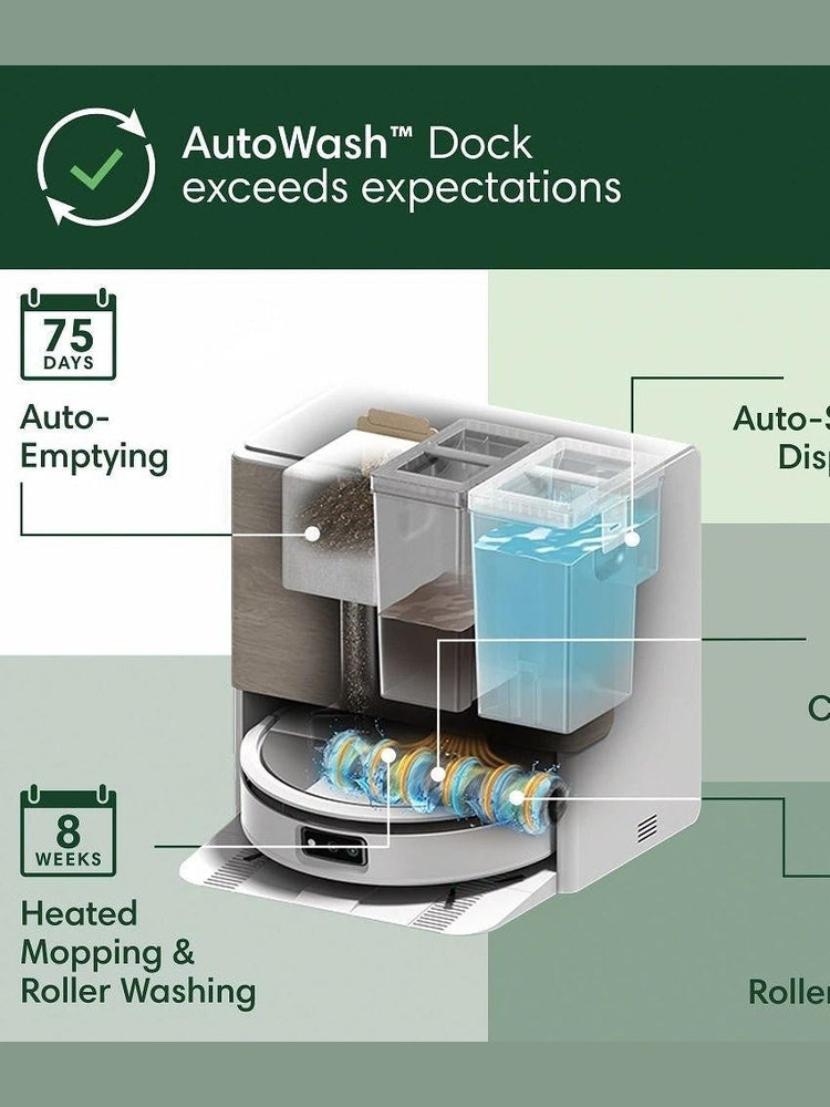 AutoWash Dock powers a pristine clean. Eliminates stubborn stains with heated mopping and the PowerSpin Roller Mop, spinning at 200 RPMs and applying consistent pressure for spotless, streak-free mopping.