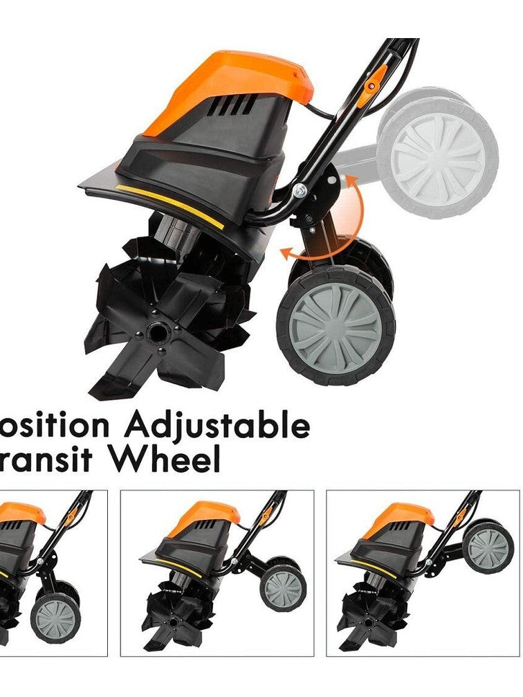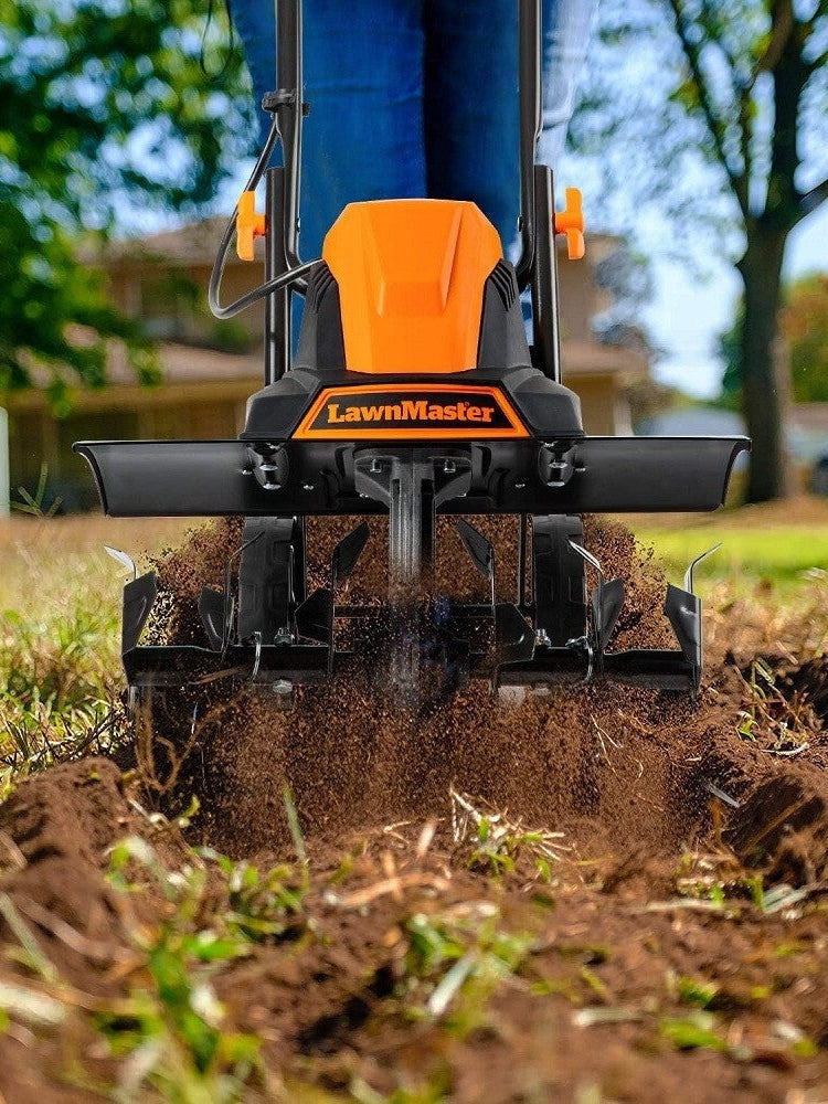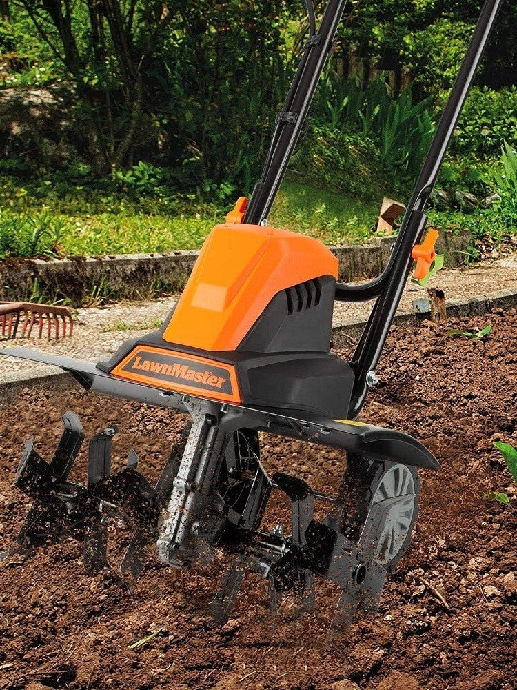 Lawnmaster TE1318W1 Electric Tiller Features Powerful 13.5-amp motor and 6-steel blades cuts through the roughest terrain. Runs at 390 RPM when free-spinning. This electric tiller provides a green, clean and efficient alternative to gas-powered tillers.