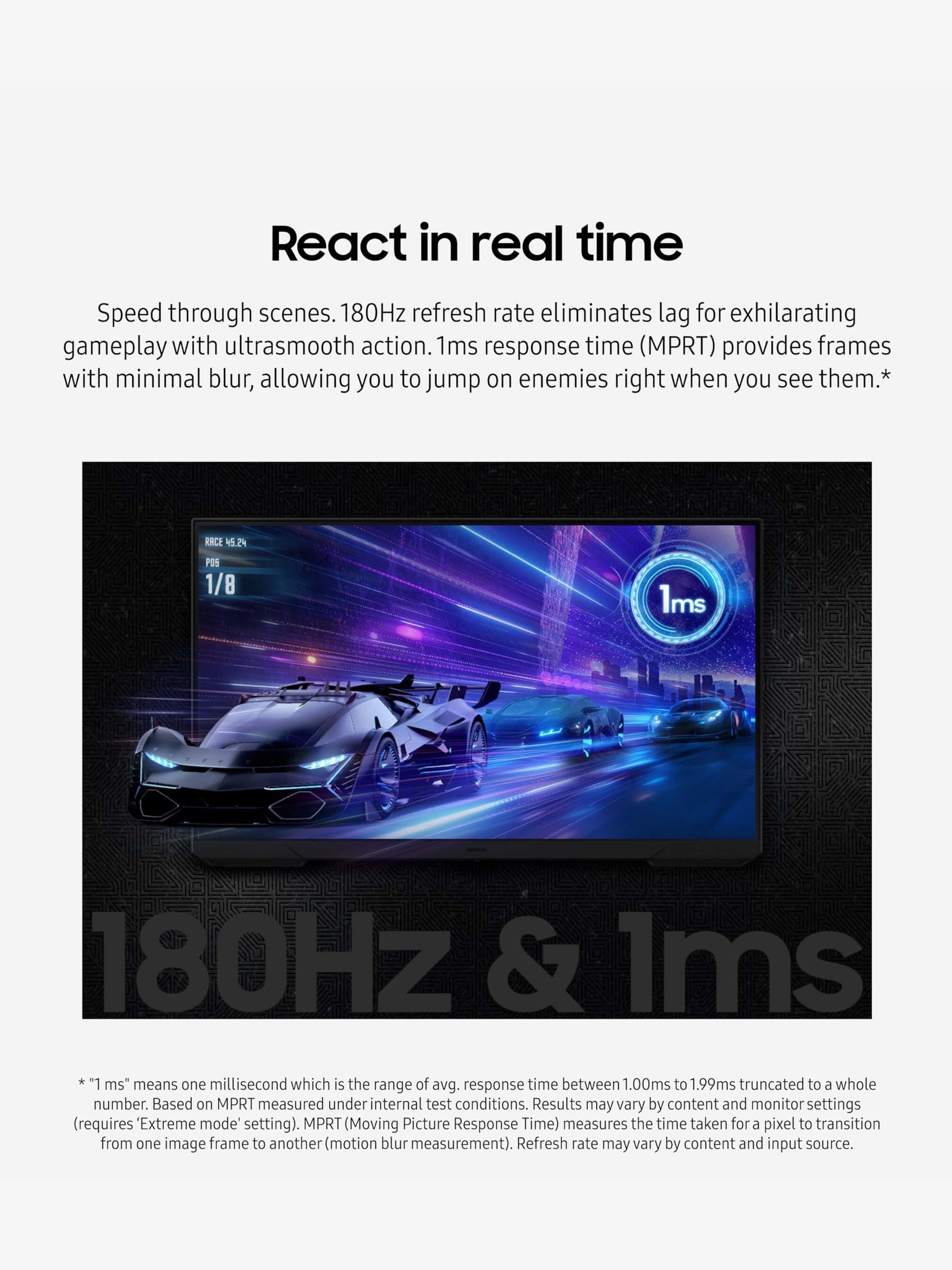 ¹"1 ms" means one millisecond which is the range of avg. response time between 1.00ms to 1.99ms truncated to a whole number. Based on MPRT measured under internal test conditions. Results may vary by content and monitor settings (requires ‘Extreme mode' setting). MPRT (Moving Picture Response Time) measures the time taken for a pixel to transition from one image frame to another (motion blur measurement). Refresh rate may vary by content and input source. ²Images simulated for illustrative purposes.