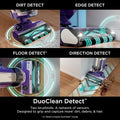 • DUOCLEAN DETECT: Two-brushroll system with four Intelli-Sense sensors automatically senses and reacts to hidden dirt, debris and pet hair and boosts suction and brushroll speed for optimal performance on both carpets and hardfloors.