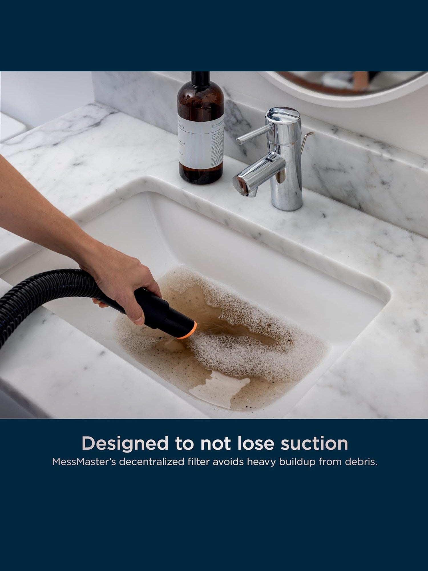 - DESIGNED TO NOT CLOG OR LOSE SUCTION: MessMaster’s decentralized filter avoids heavy buildup from debris, meaning you won’t rapidly lose performance as you clean tough messes.