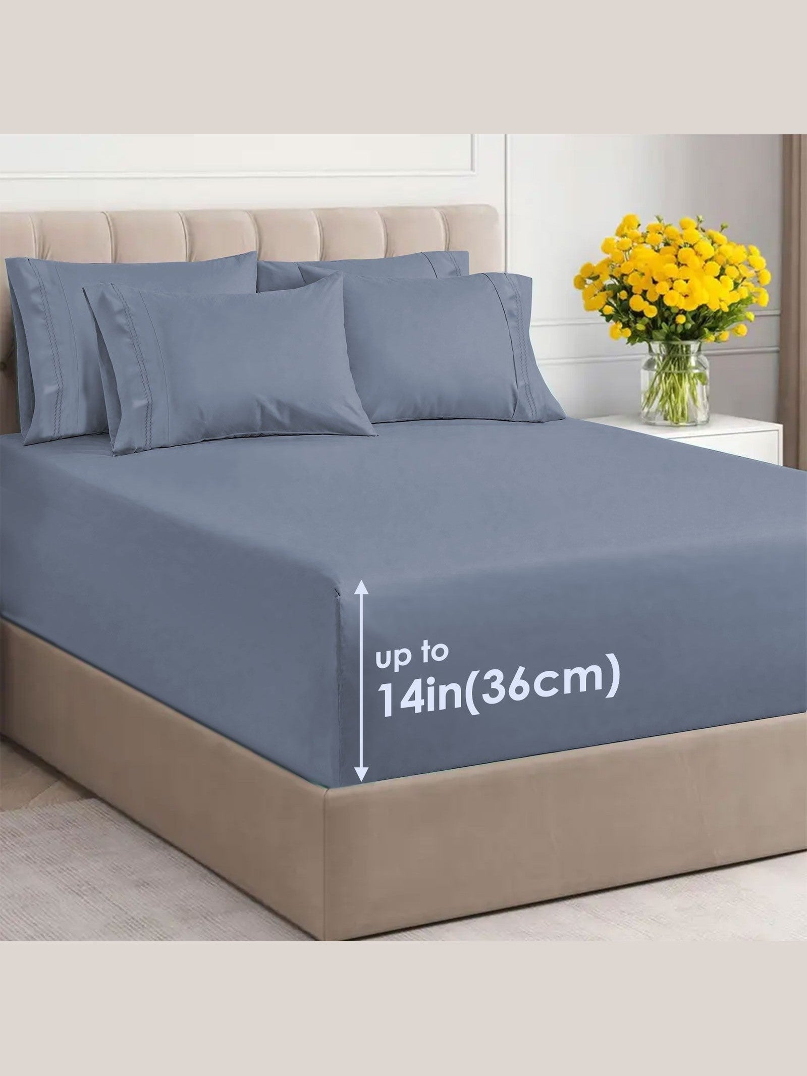 Deep Pocket Sheet Set: Experience a secure fit with the elasticized deep-pocket fitted sheet, accommodating mattresses up to 14 inches thick. It fits snugly even if your mattress is slightly thinner, and with more and more beds using thicker mattresses, this depth is a versatile choice for most households.