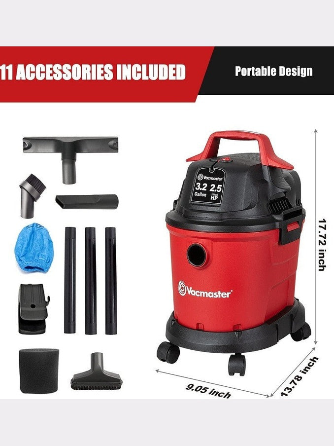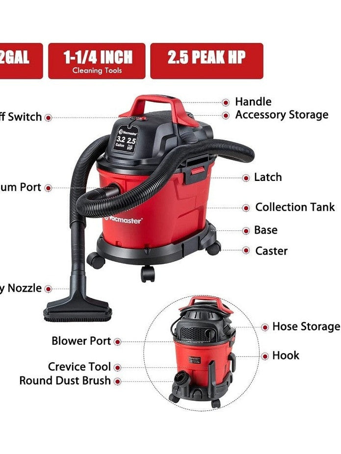 Vacmaster 3.2 Gallon 2.5 Peak Wet Dry Vacuum Cleaner Wall Mounted Portable Red
