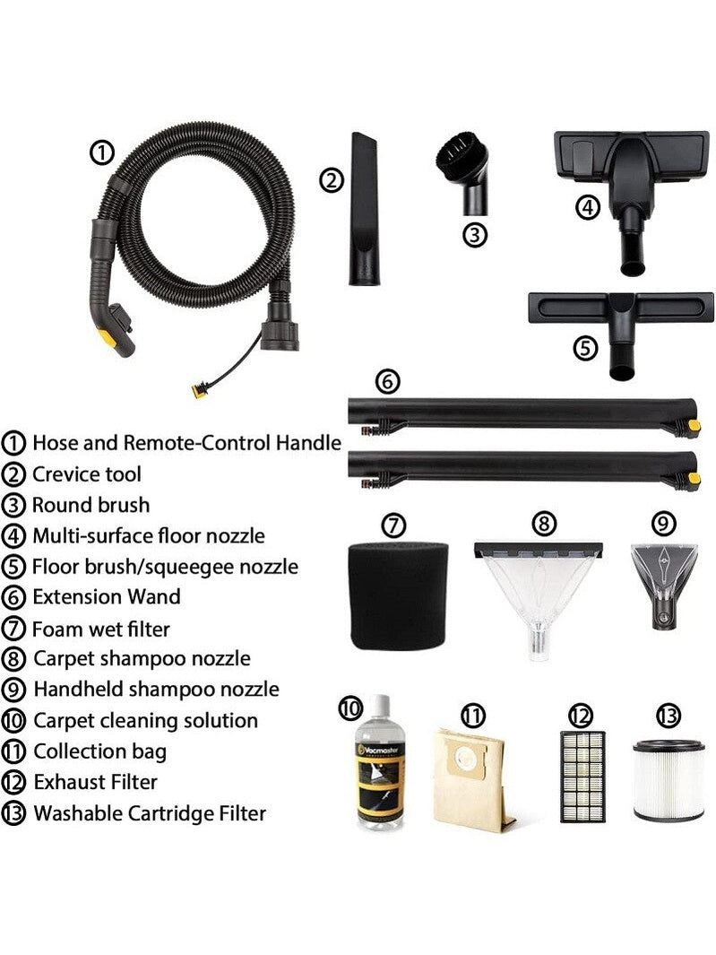 Wet/ Dry/ Shampoo Spray 3 in 1, PTFE cartridge filter and HEPA material filtration, Low Noise, Remote control Handle, Blower, Carpet Cleaning, Handle Controls, Portable